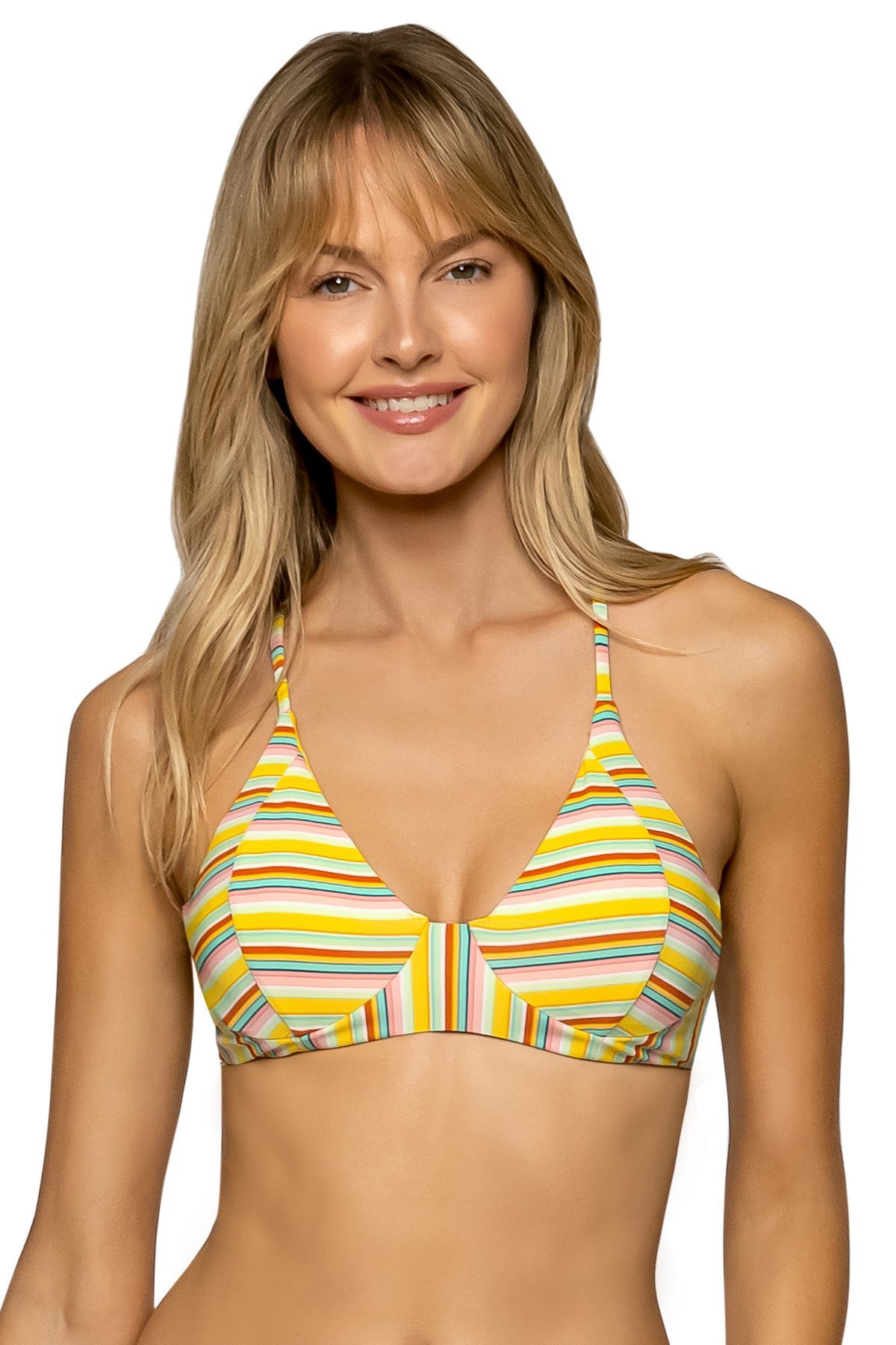 This bandeau top gets a feminine update with ruffles. Get minimal tan lines and a secure fit with removable, adjustable straps.